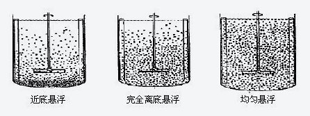 促使懸浮物進入液體的一個重要原因是流體漩渦的形成,因此,能夠使流體產生強烈漩渦的攪拌器才能夠產生較強的懸浮能力,如能夠強制流體向下流動的45°斜槳。